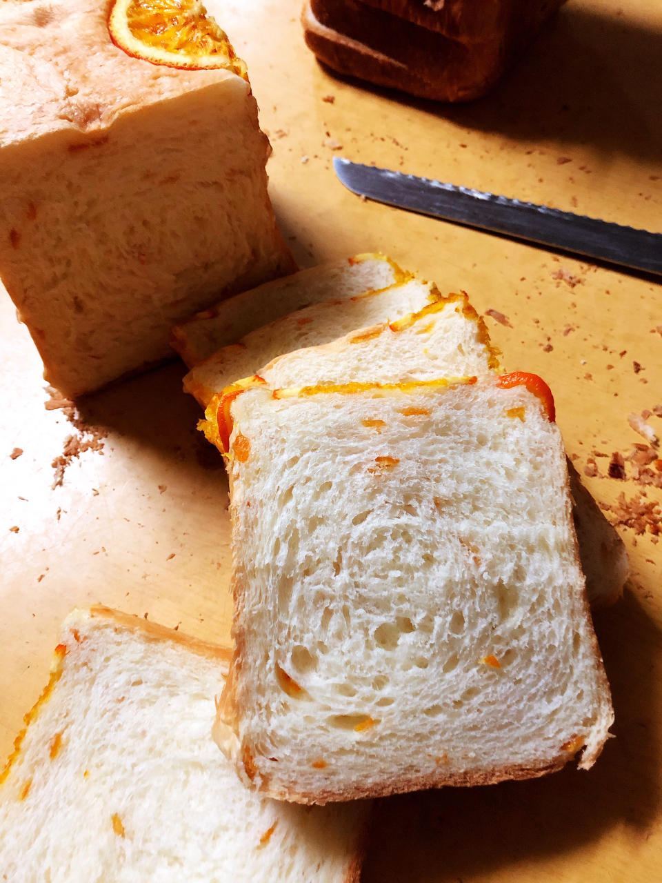 一个没有放橙子片,用的低糖吐司模具,上火165,下火185烤38分钟,两个表面上色严重了点,底部有橙子片的颜色刚好,没有...
