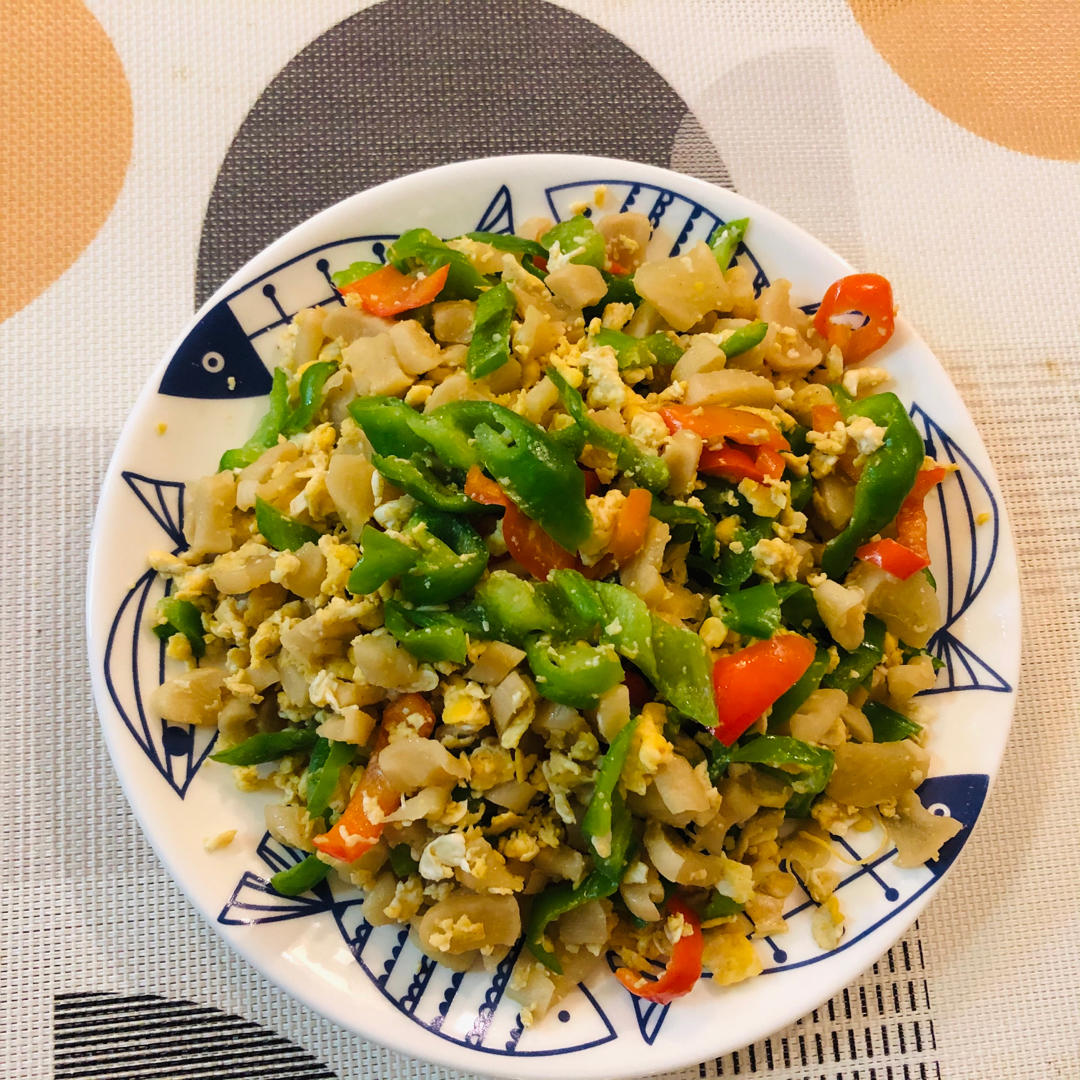 热锅下油,鸡蛋直接打下去🤪炒散,放萝卜干,放青红辣椒,炒啊炒,试试味道,淡了放盐,萝卜干会有点咸味了,炒到好起锅