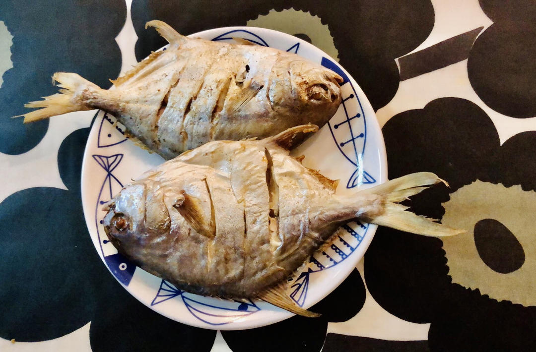 就是鱼抹点椒盐和油,放烤箱230度20分钟,之后那出来倒掉盘里的水,翻面再200度烤10分钟,超级懒人做法。