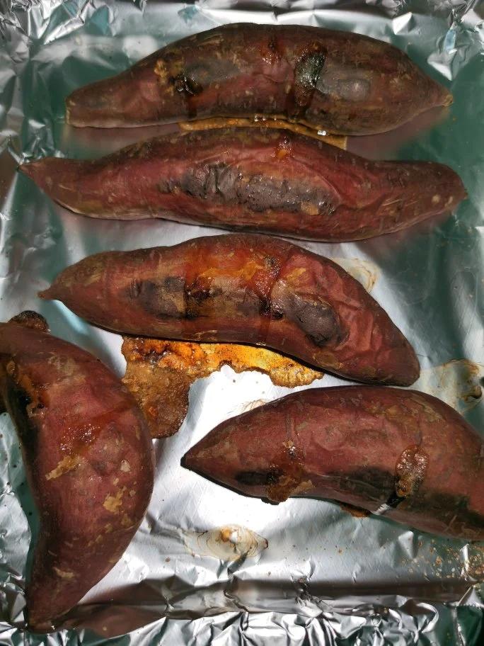 买甜心蕃薯,将红薯洗干净,放在铺了锡纸的烤盘上,入烤箱中层,开200度,烤30分钟,翻过来再烤30分钟,烤出糖浆即可。