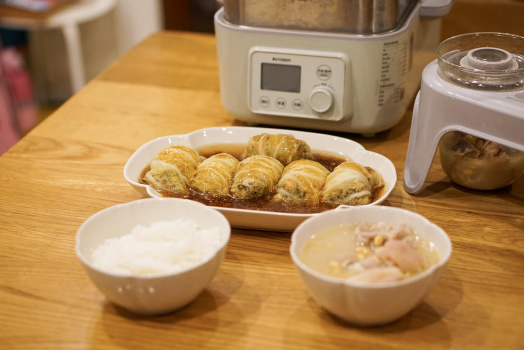 这樣炖猪手黄豆汤超贊的,白菜肉卷简單好吃!