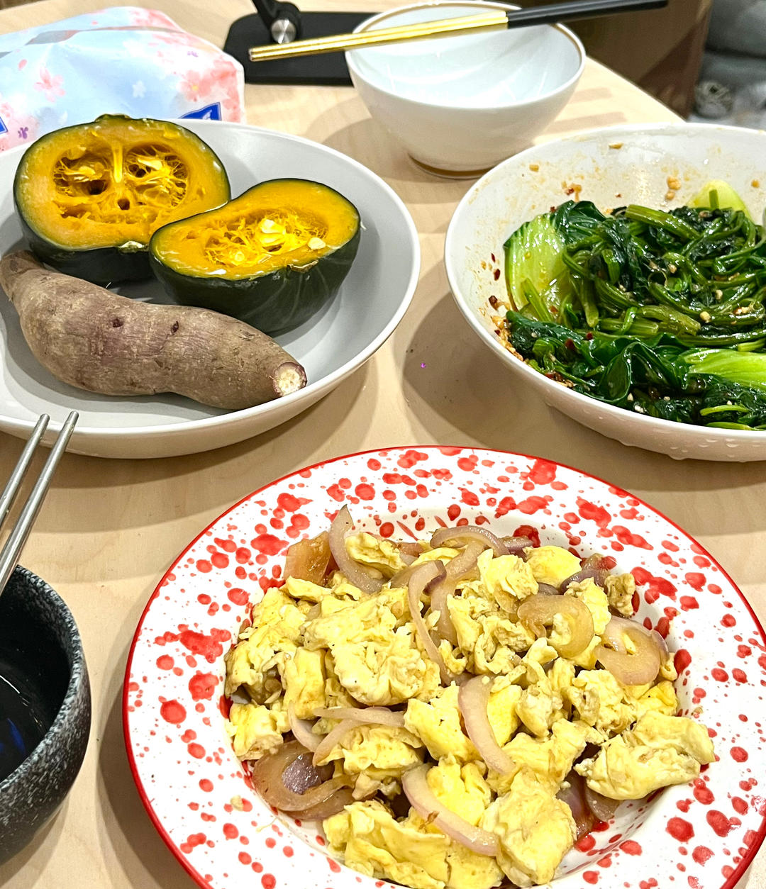 凉拌菠菜上海青 贝贝南瓜 冰激凌小香薯 洋葱炒蛋