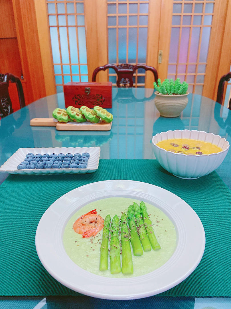 早餐分享;低卡减脂芦笋浓汤🍤🍵+红枣板栗南瓜小米粥🌰🎃+菠菜汁华夫饼🥬🧇+蓝莓🫐;早安友们,早餐愉快😘🍒🍒