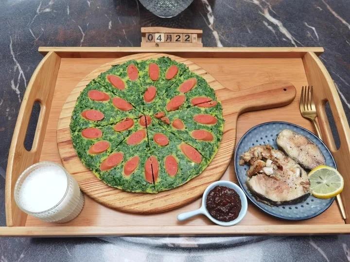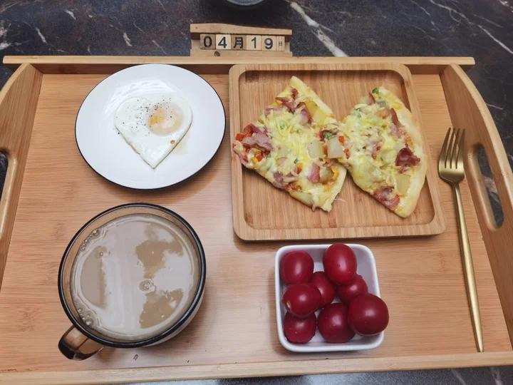 早安~今天吃培根土豆披萨,煎蛋,山药小米羹。小番茄
