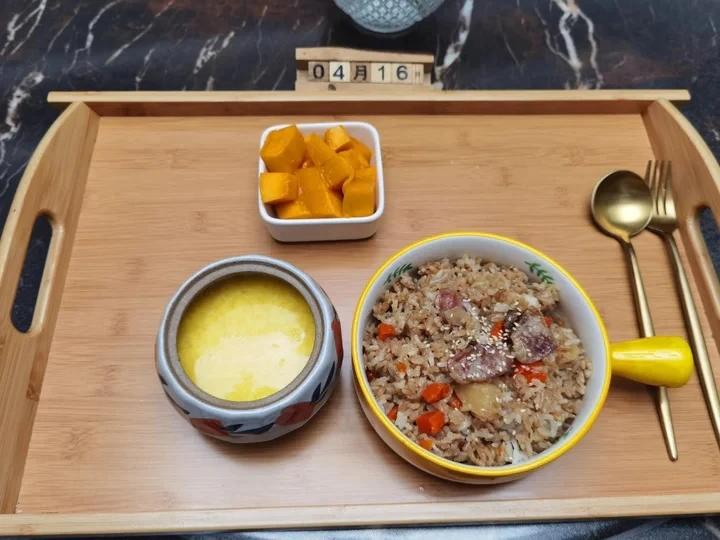 早安~今天吃腊肠土豆闷饭,蛋花甜羹,芒果