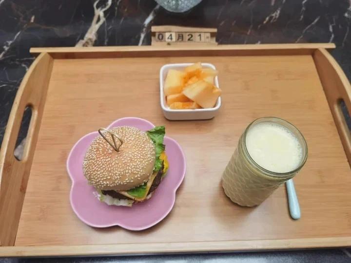 早安~今天吃牛肉煎蛋汉堡,哈密瓜,奶香玉米汁