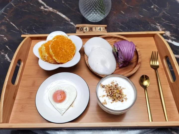早安~今天吃毛线球馒头,蒸米糕,煎蛋,酸奶玉米片,橙子