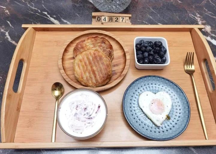 早安~今天吃大葱肉酥饼,煎蛋,果酱酸奶,蓝莓