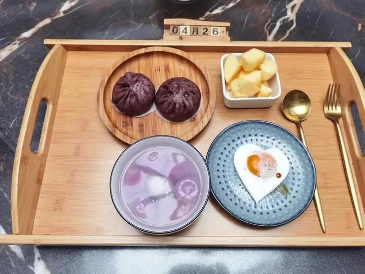 早安~今天吃黑米肉包子,煎蛋,黑芝麻汤圆。黄苹果