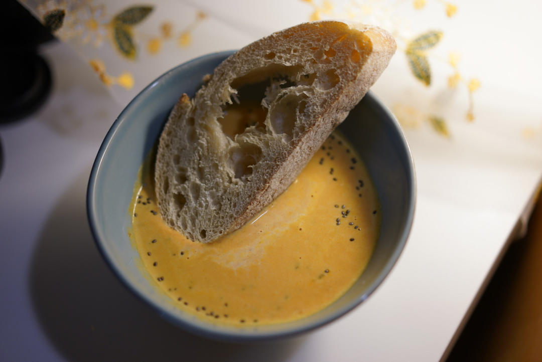 继续发存图哦,天冷啦,煮了一个南瓜奶油浓汤,配上ciabatta。