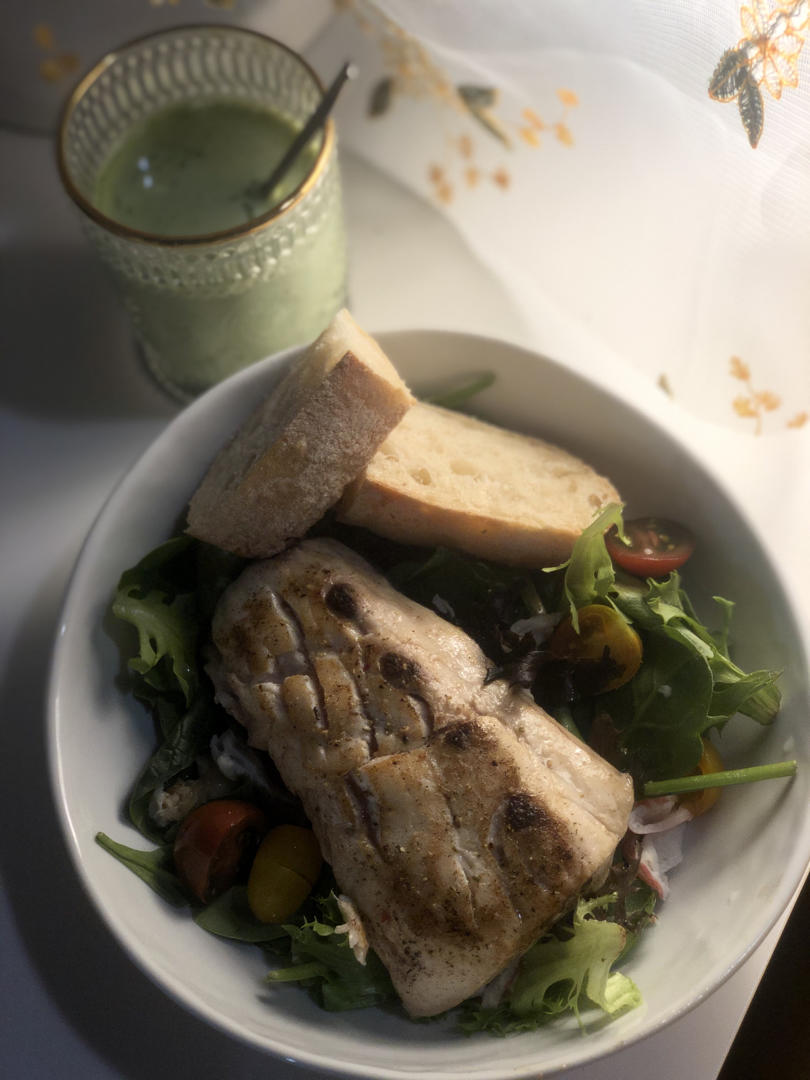 去港口买的sea bass,也太好吃了吧!晚上就不吃碳水啦,一点沙拉做base。