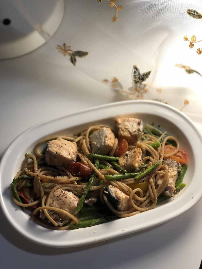 暖暖的意面,蛋白质用的是三文鱼,加了芦笋和小番茄。
