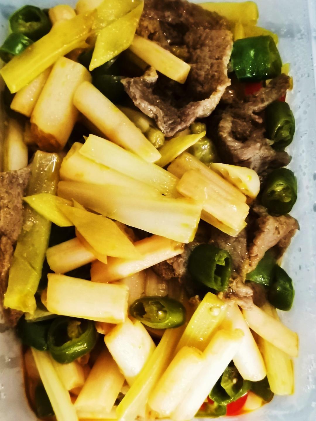 酸辣藕尖炒牛肉:大周末的,一大早就爬回科室加班搞资料,午饭直接叫的外卖,吃饱继续干,一直搞到晚上七点钟才结束!颈椎病腰椎...