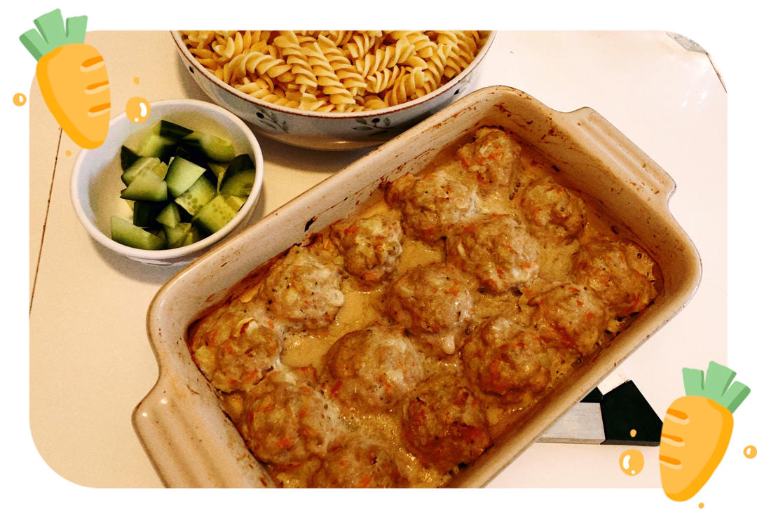 工作日的简餐:烤鸡肉丸子+意大利面。