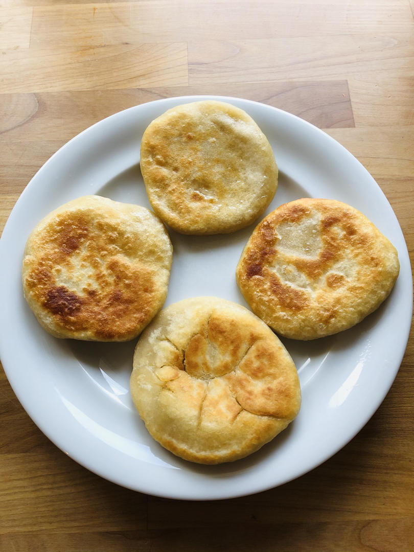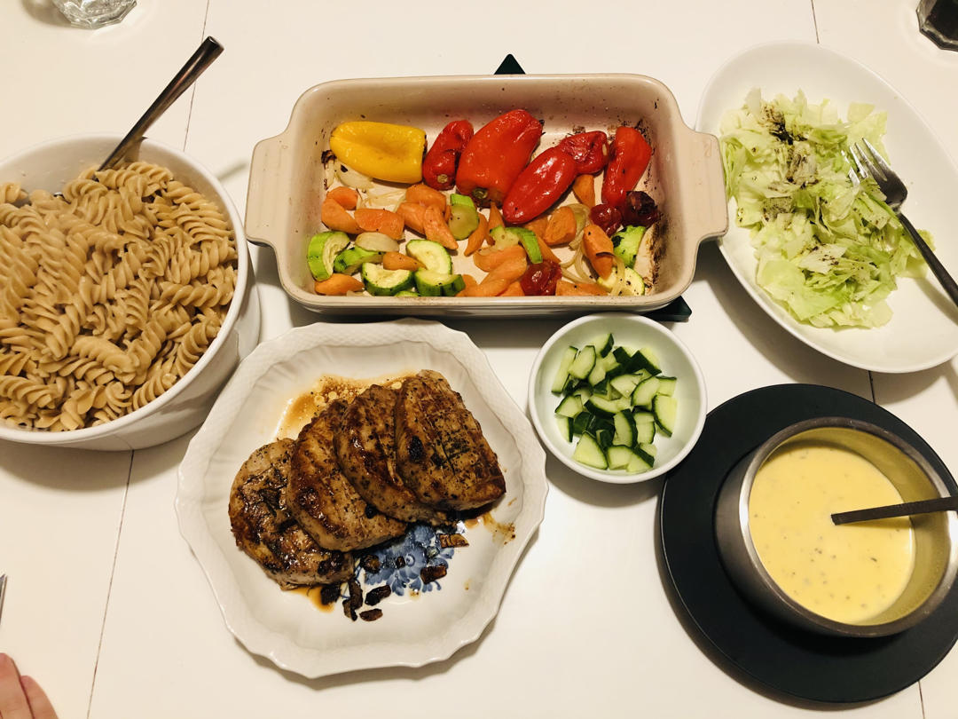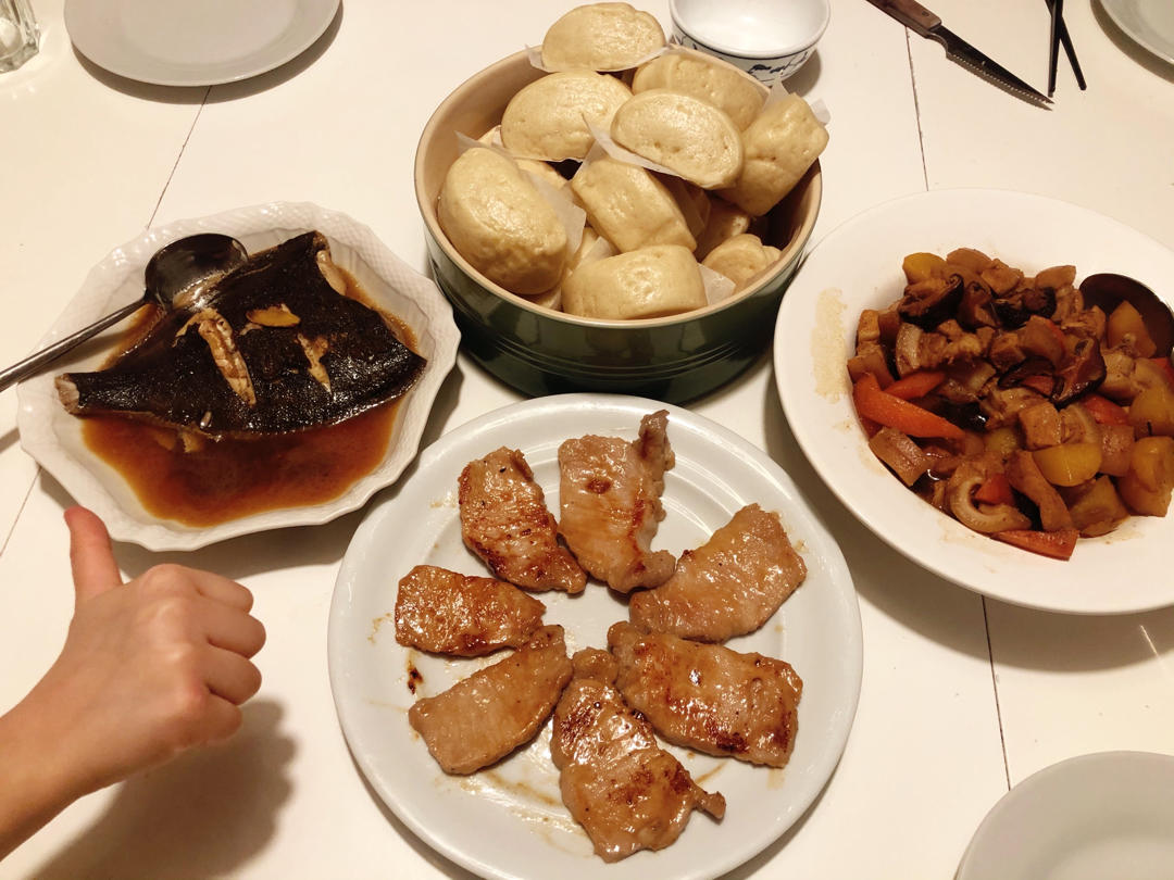 做了一桌子不知道该怎么搭配的菜,唯一还挺搭的两道菜是:馒头夹烤肉。孩子们很开心,在我拍的时候,女儿伸出了她可爱的大拇指👍...
