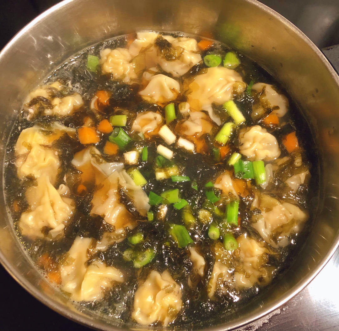 今天必须纪念一下,在冰天雪地里走了,玩了4个半小时。💪 回家来简单地做一锅热腾腾的云吞汤,幸福呀!😊