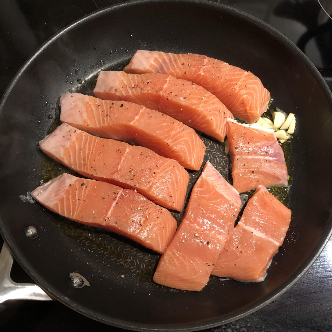 全家人最爱的三文鱼,又简单又美味。😋 很适合工作日的一道晚餐,一边煮意面,一边做沙拉,一边煎鱼,最后一份随便煮但与意面还...
