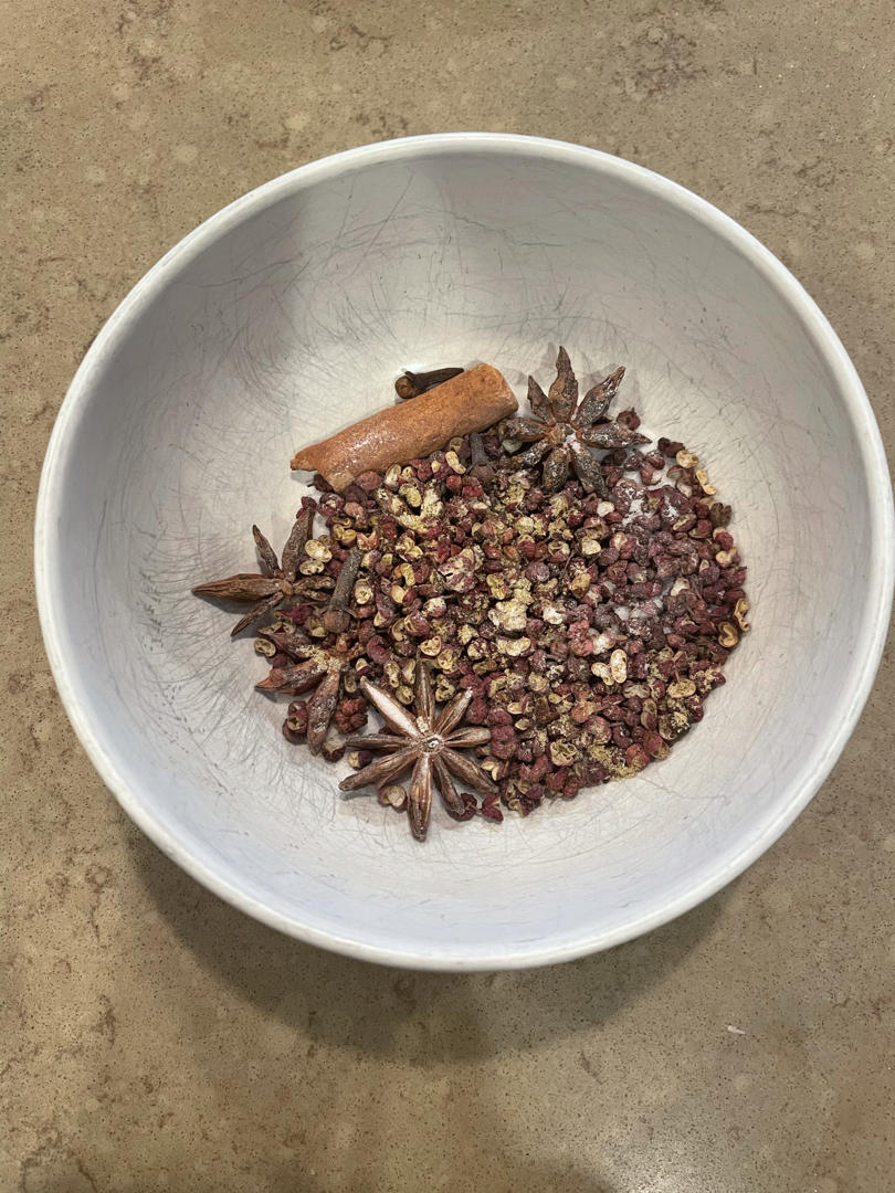 八角4个,丁香3个,花椒10克,盐15克,小茴香1/2tsp,桂皮一块,水600克。水开后,加入所有材料再煮开,然后小火...