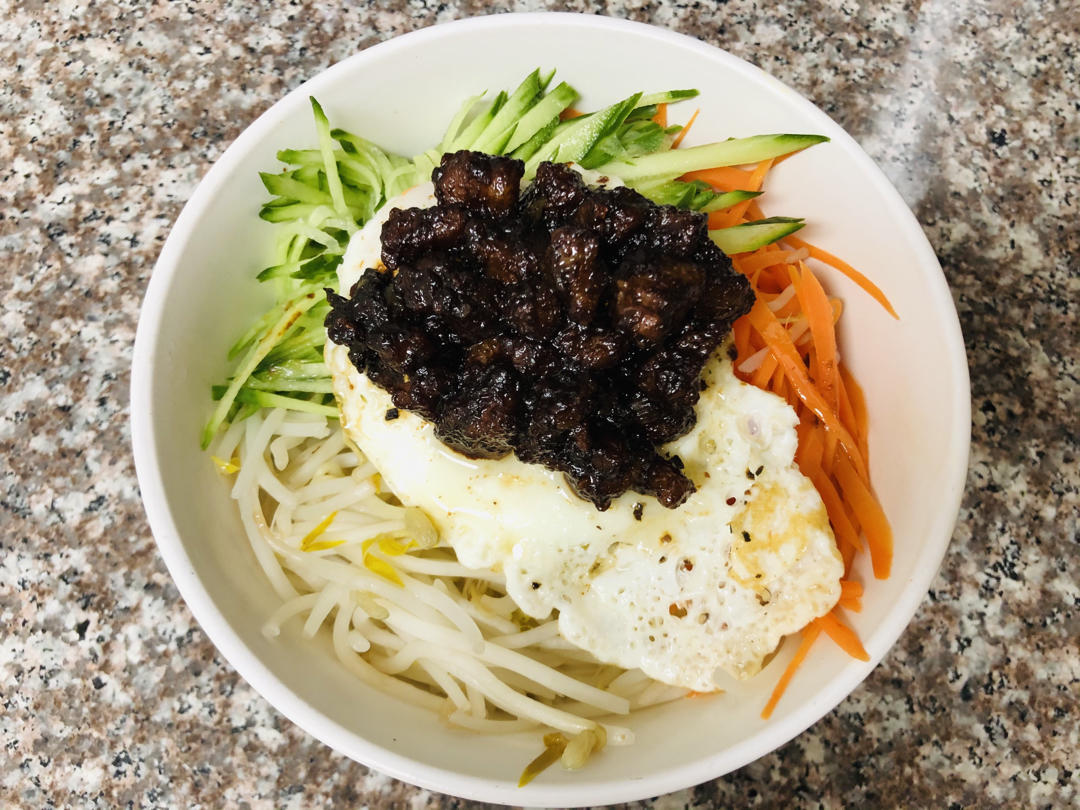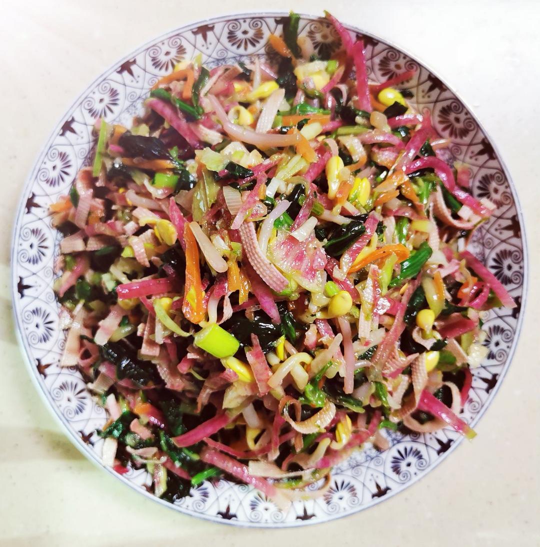 冷拌素菜,用了六种蔬菜,有豆芽,豆皮,红萝卜,心里美萝卜,菠菜,黄瓜。