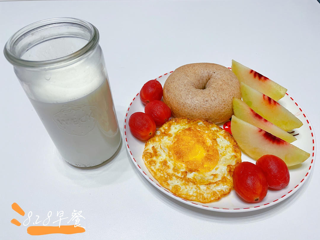8.28早餐:牛奶 煎蛋 全麦贝果 圣女果 桃子