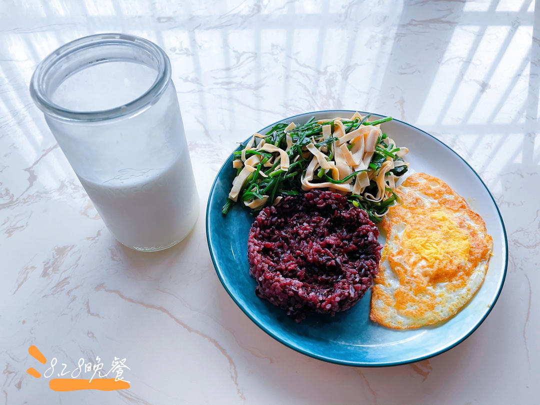 8.28晚餐:杂粮饭 牛奶 煎蛋 百叶炒韭菜