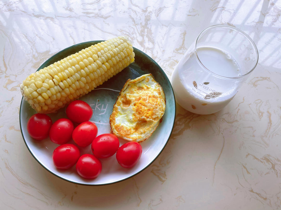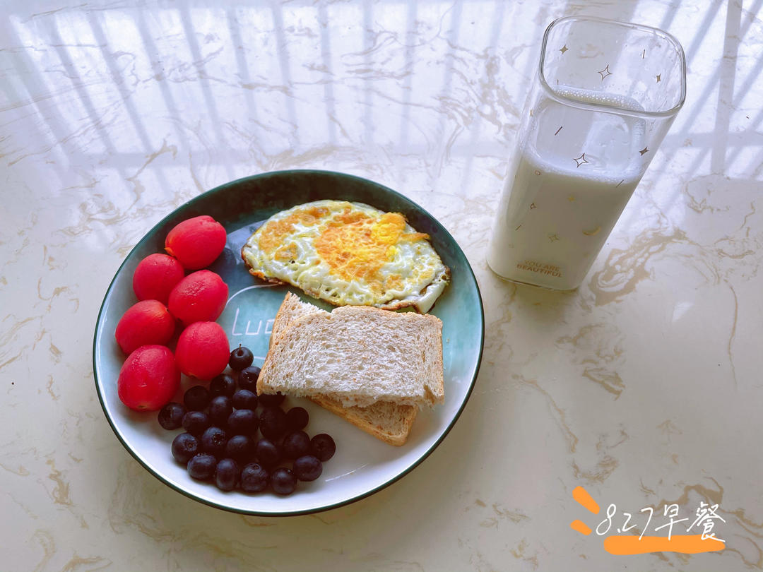 8.27早餐:牛奶、煎蛋🍳、全麦面包、圣女果、蓝莓。