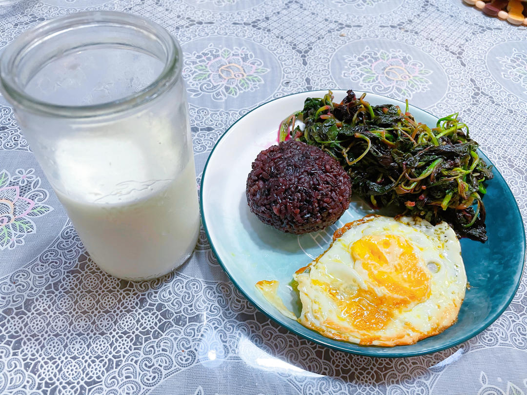 晚餐:杂粮饭,煎鸡蛋,牛奶,炒苋菜。