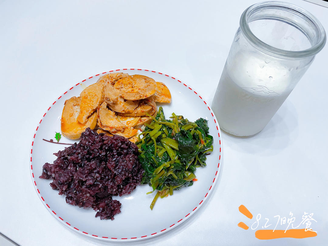 8.27晚餐:牛奶 凉拌素鸡 杂粮饭 炒空心菜