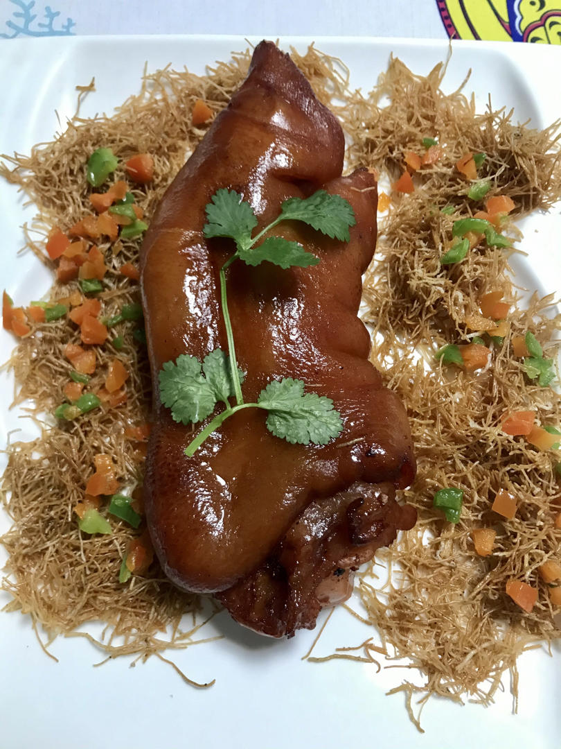 酱猪肘子光吃口味单一,搭配点油炸碎米线,再撒点椒盐粉提味,下酒必备