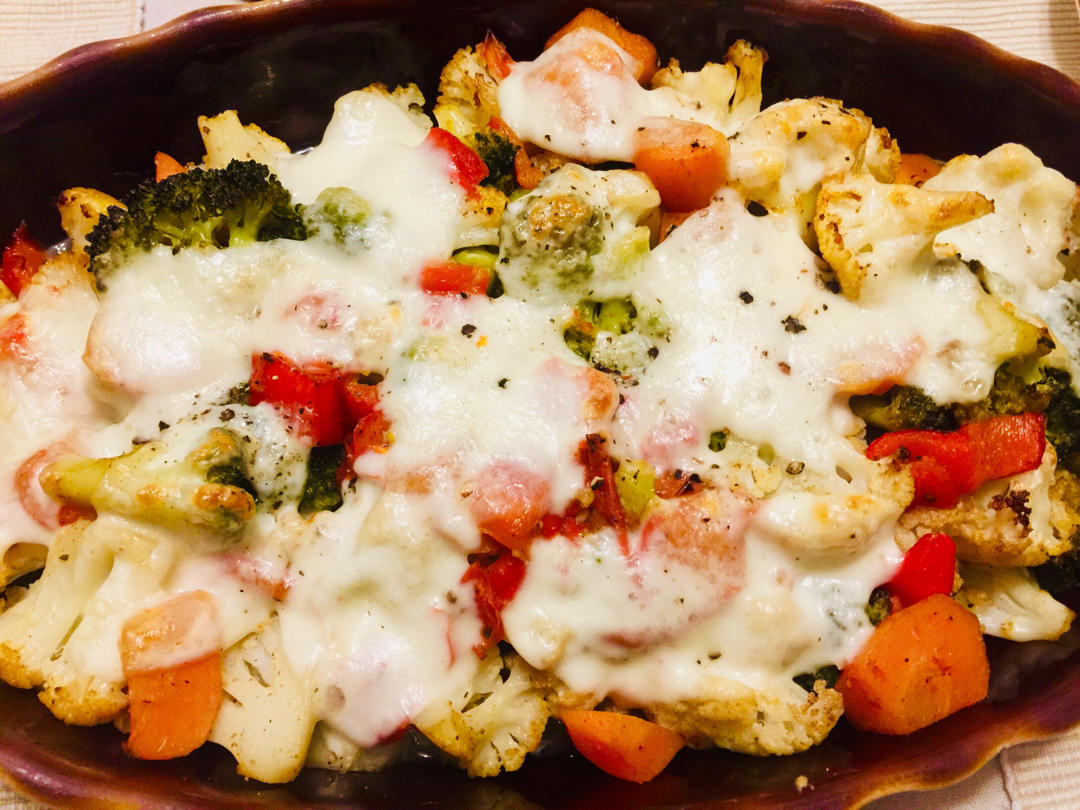 這次用Mozzarellas 焗的菜花、西蘭花、胡蘿蔔和紅椒。先生一口都不肯嚐。說一看見cheese和菜花就想起當年學生...