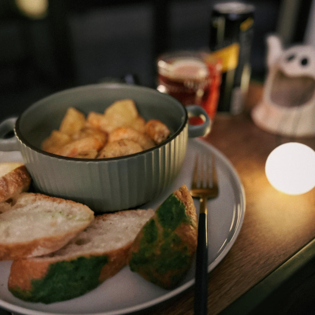 咖喱土豆虾配蒜香法棍面包