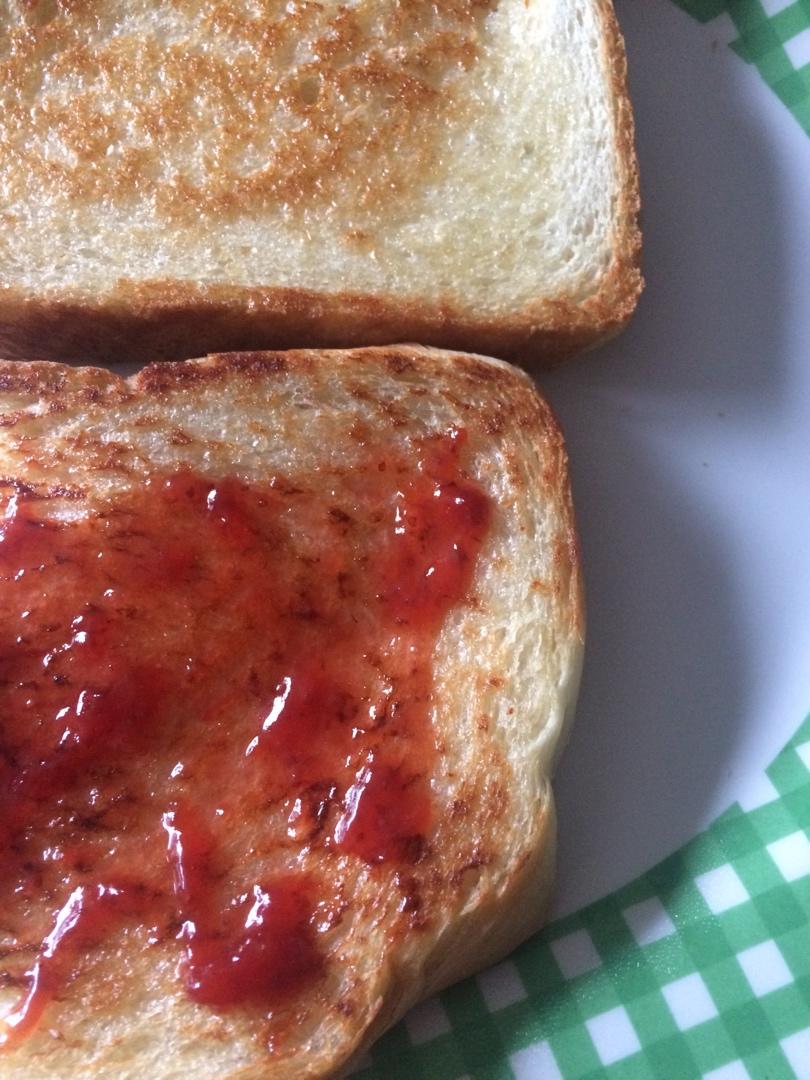 煎得脆脆的面包片配上自制草莓果酱就很好吃了!(个人口味啊我不喜欢面包片抹果酱的口感和味道,但是煎过就完全不一样了,突然变...