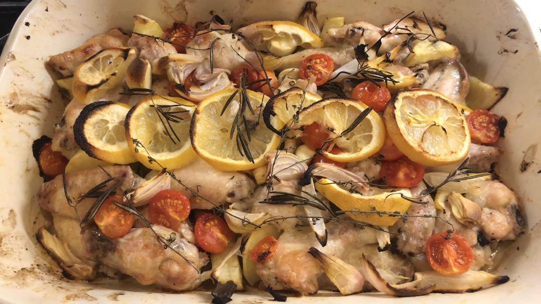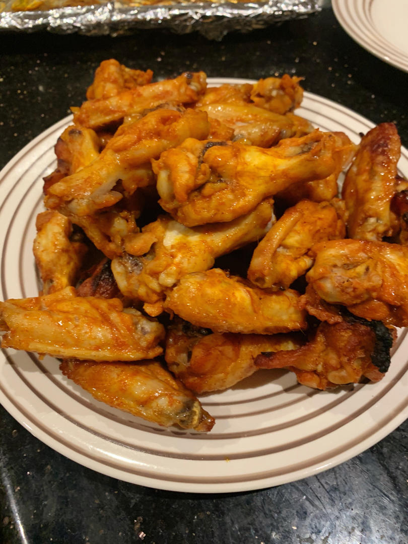 鸡翅下面摆放一层红薯块(事先煮好沥干并撒上橄榄油),额外加入shallots,红薯又糯又甜还浸满鸡翅的鲜味,主食配了意面...