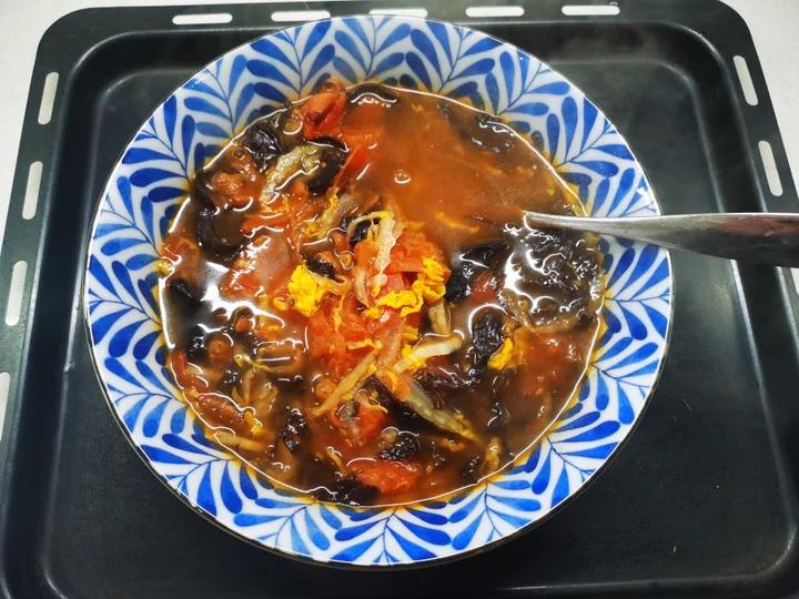番茄木耳紫菜黑椒汤(口感类似于胡辣汤),用的黑椒酱,盐,蔬之鲜