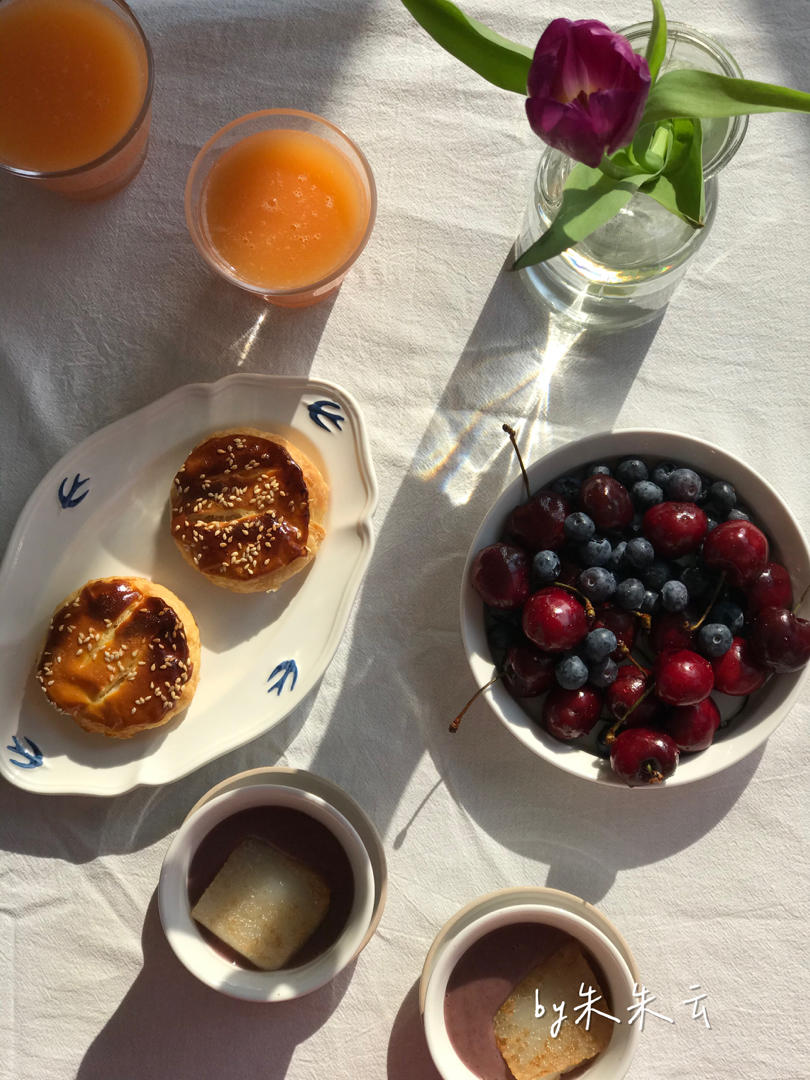 20210121苹果胡萝卜香梨热饮+红豆沙椰汁年糕+车厘子蓝莓+老婆饼。
