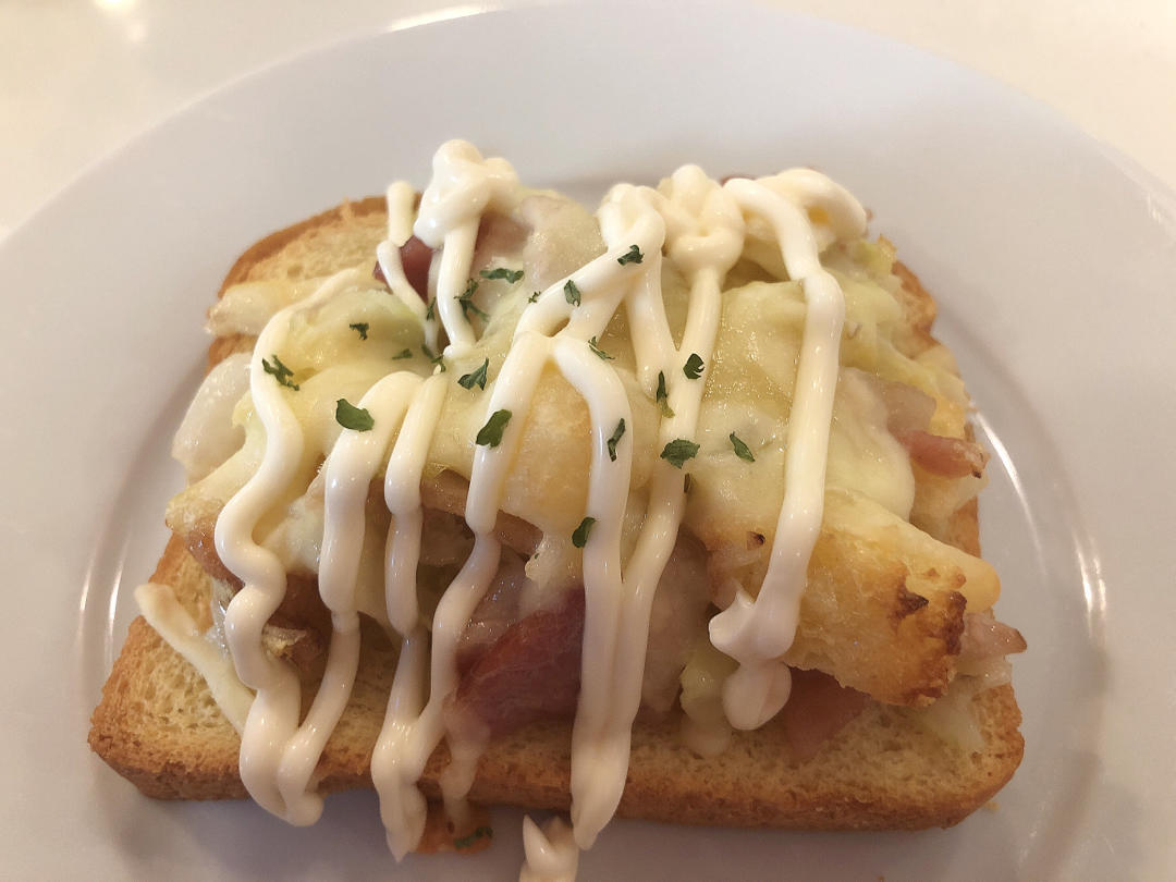 将培根、卷心菜丁、烤吐司丁、蛋黄酱混合抹在brioche吐司片上,撒上芝士碎烤10分钟,最后在淋上蛋黄酱和parsley...