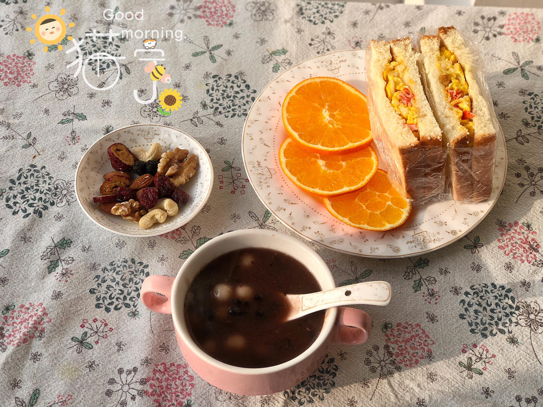 蟹柳蛋三明治+红豆沙小圆子+坚果+橙子🍊