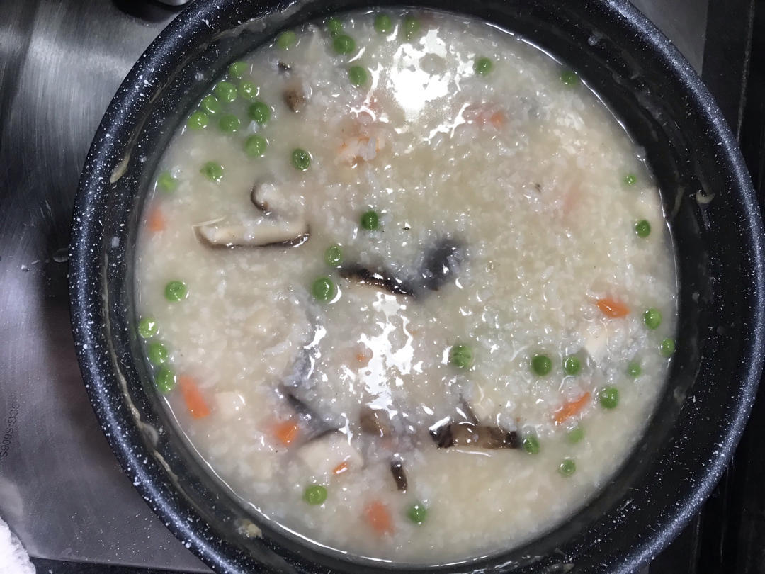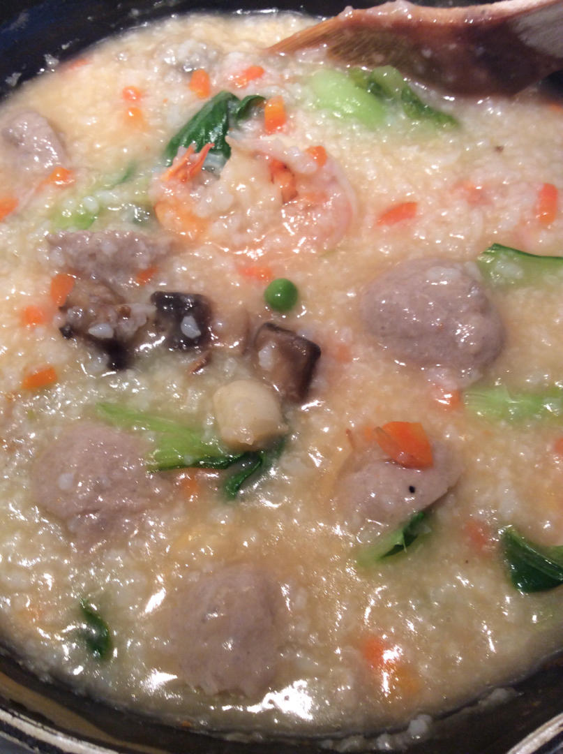 大虾仁🍤、仙贝、牛肉丸子、鲜蘑菇、🥕丁、小豌豆、虾籽酱;混合蔬菜:莴笋叶子🍃、小青菜🥬;添加蔬菜味精、白胡椒粉、盐,撒点...