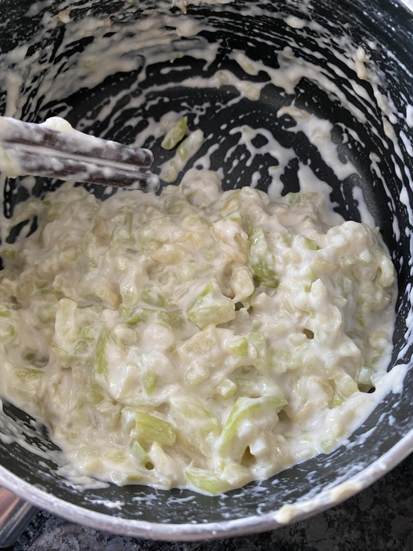 做个稍微复杂点的。前几天剩下的半个芥菜切丝,汆热水,加面粉和水搅拌,平底锅放点油任意把面...