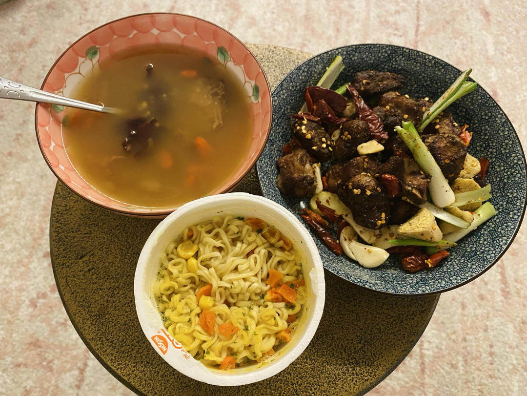小米粥,日清杯面配椒盐排骨