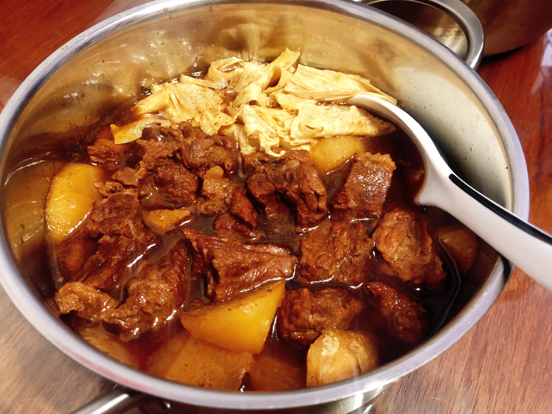 南昆山买的腐竹,前一晚用姜片、柱侯酱、海鲜酱、白酒、啤酒爆香焯水的牛腩块,加热水炖40分钟,关火腌一晚。翌日早晨,放飞水...