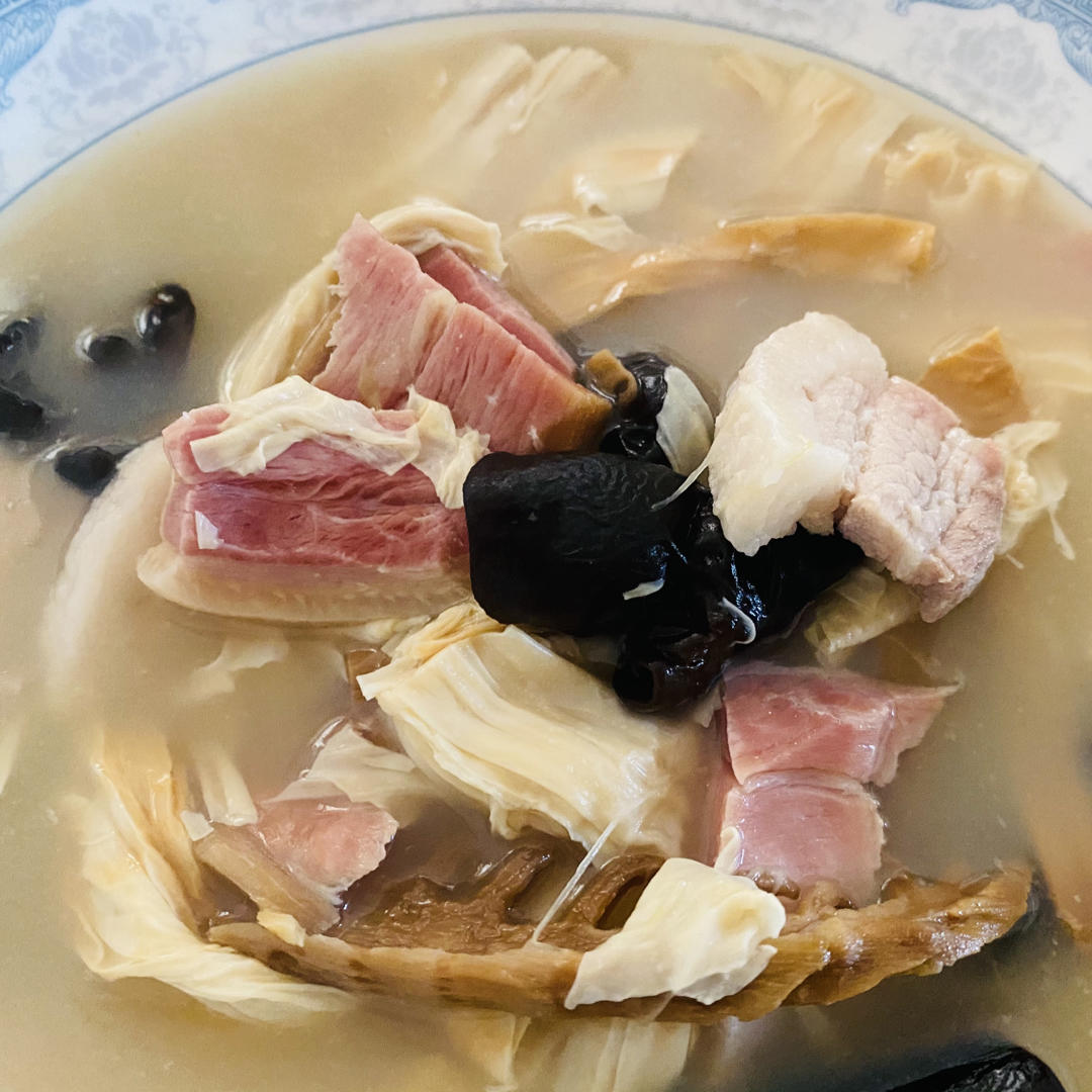 木耳代替银耳,用的煮好的笋干,好吃!腐竹口感很棒!金华火腿加的有点多,不加盐都挺咸的,...
