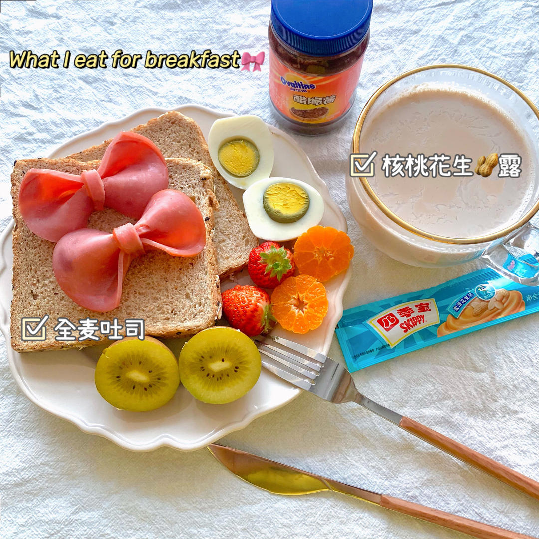 全麦吐司➕火腿片➕水煮蛋➕黄心猕猴桃➕草莓➕砂糖橘➕花生核桃露