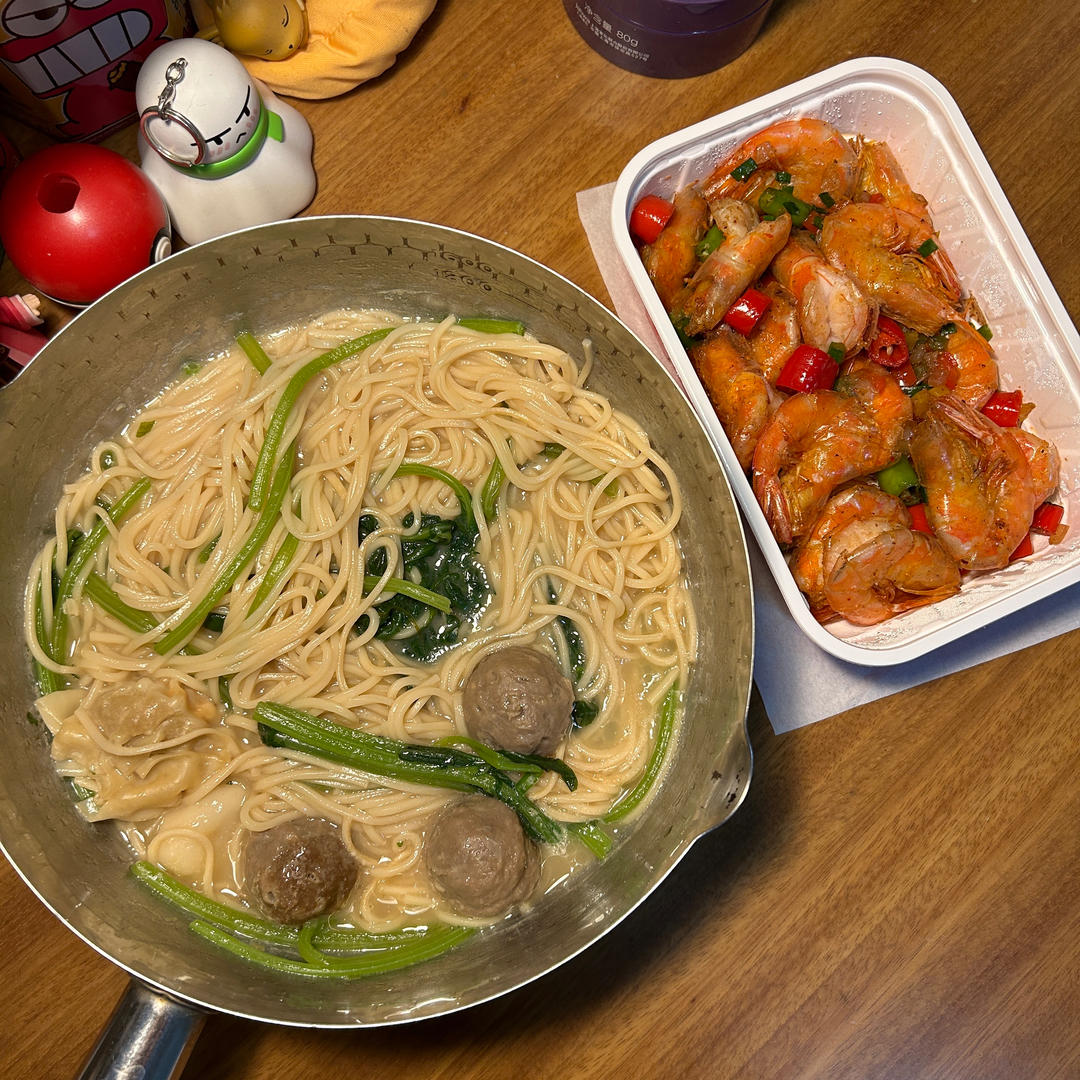 黄梅天又闷又热还下大雨,随便煮点拉面凑合一顿。饿了吗周五抢的32-16优惠券叫了个椒盐虾,还不错。#晚餐•2023年6月...