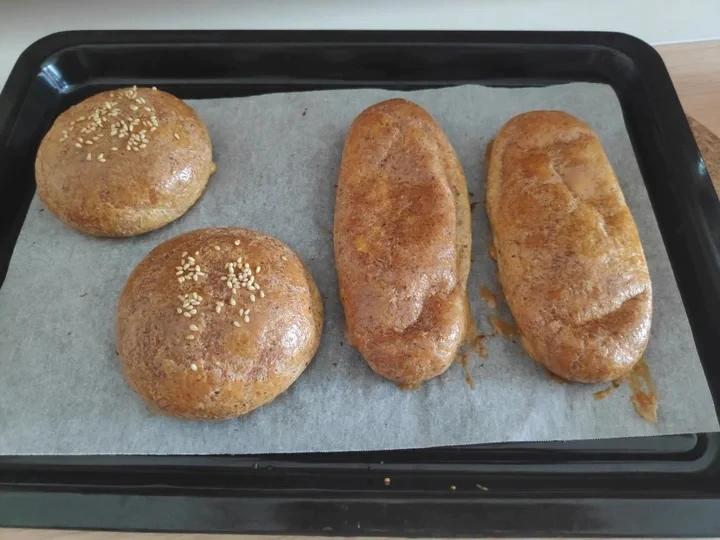 沒有杏仁奶用的水,另外一個刷面用的蛋黃用了淡奶油代替。跟食譜做法,熱狗做成瘦長高的形狀,漢堡胚輕捏成圓形。瘦小的麵團烤的...