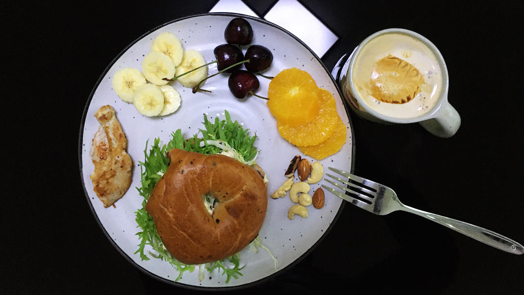 贝果三明治,水果,煎鸡胸,无盐坚果,拿铁。