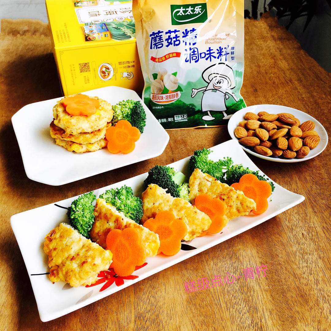 低脂的鸡胸肉🐔搭配白蘑菇🍄、玉米粒🌽、西兰花🌳,加入太太乐蘑菇精调味料提味增香,煎出的鸡肉饼呈现蘑菇...