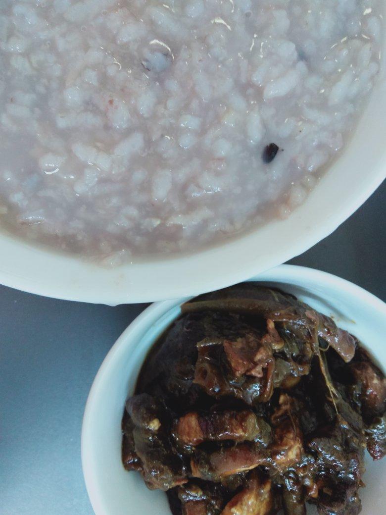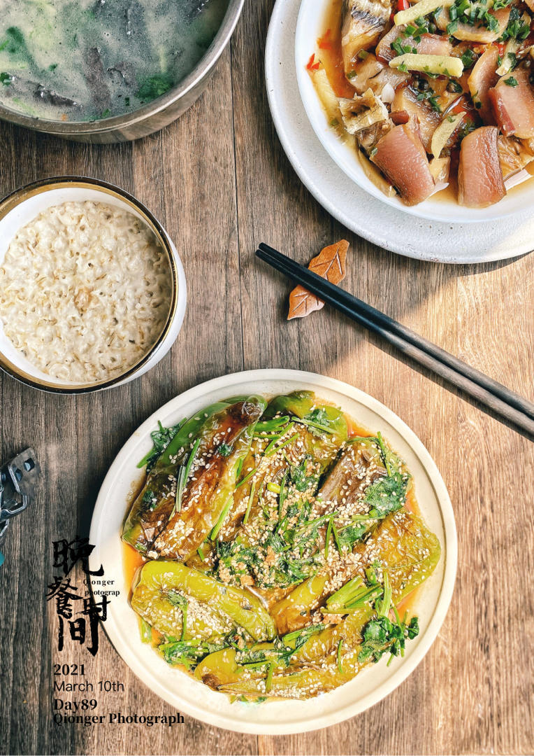 午餐:煎辣椒包肉+金华火腿蒸腊鱼+鸭血汤+燕麦杂粮饭