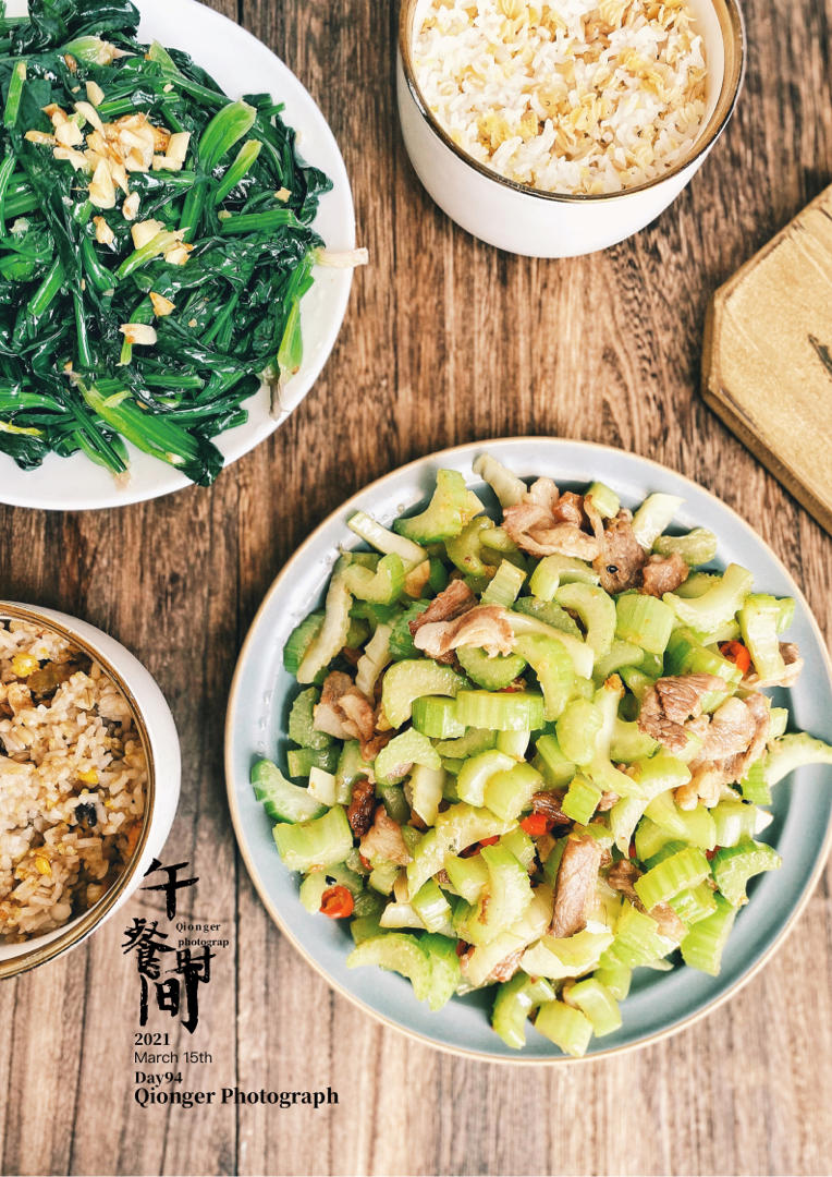午餐:西芹炒肉+清炒菠菜+杂粮饭