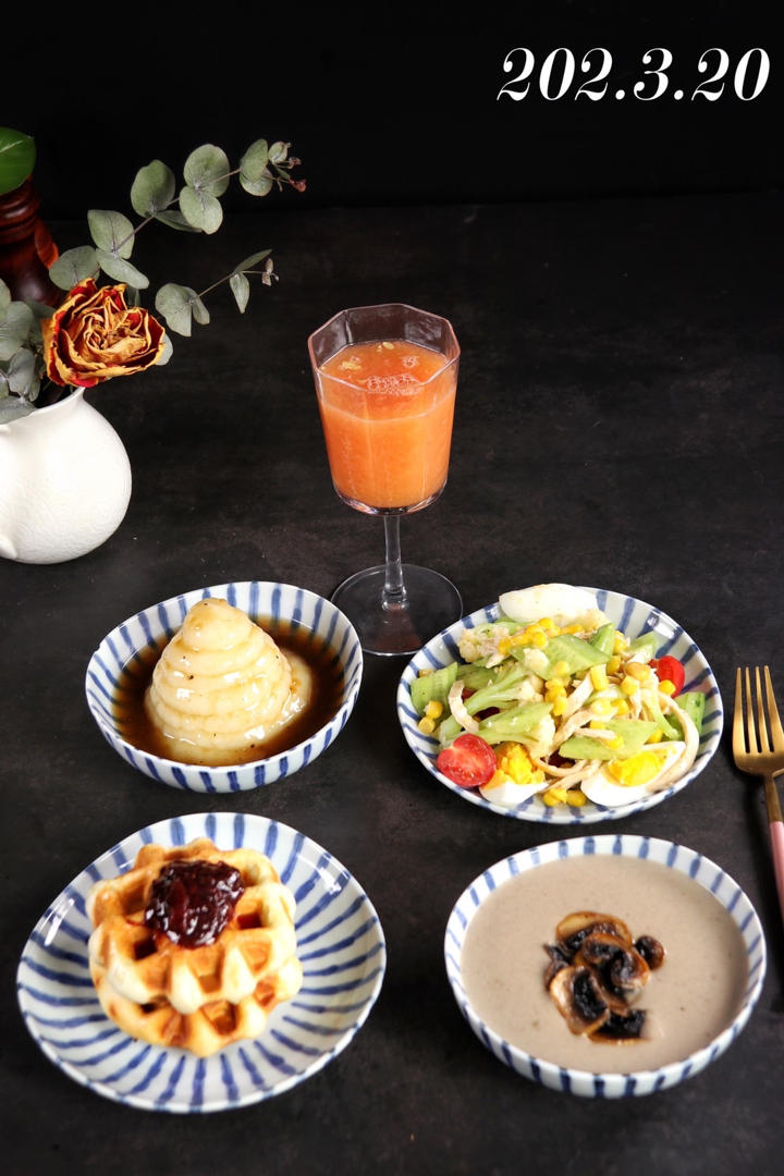 鸡汁土豆泥、鸡肉沙拉、紫米华夫饼、奶油蘑菇汤、...